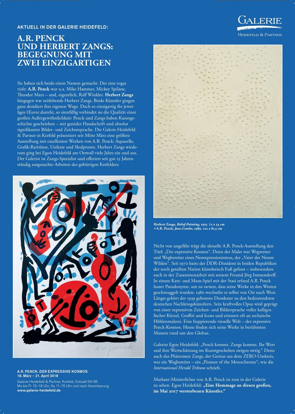 Er war ein Freigeist und nahm sich viele Freiheiten - namentlich auch mit sich selbst. Denn eigentlich hieß einer der bedeutendsten Nachkriegskünstler Deutschlands nicht A.R. Penck, sondern von Geburt Ralf Winkler. Wohl auch teils in einem Verwirrspiel mit der DDR-Staatssicherheit nannte sich der Maler zudem Theodor Marx, Mike Hammer, Mickey Spilane oder schlicht "a. Y." oder "Y". Es war ein Spiel des hochproduktiven Freigeistes mit wechselnden Identitäten - das Spiel einer Persönlichkeit mit vielen Facetten, das eine originäre Maler-Identität und eine unverkennbar eigene Bilder- und Zeichensprache hervorbrachte. Die Galerie Heidefeld & Partner freut sich, ab dem 18. März 2018 eine größere Ausstellung mit exzellenten Werken von A.R. Penck präsentieren zu können. Eine Hommage an den am 2. Mai 2017 in Zürich verstorbenen Künstler..
