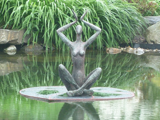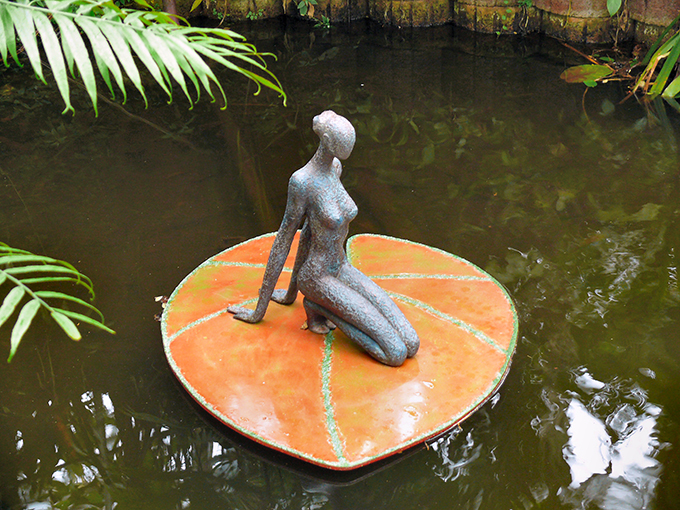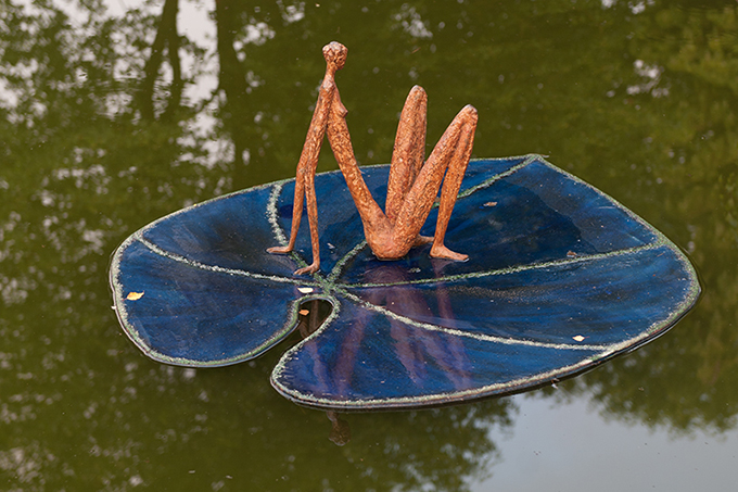 *Information zum Aufbau: Für die schwimmende Basis solcher Skulpturen formt die Künstlerin zunächst aus Polyester ein Seerosenblatt-ähnliches Werkstück (es ist das Material, wie es meist auch im Surfbrettbau verwendet wird). Mit ganz klein gemahlenen Kieselsteinchen gestaltet Ringnalda nun auf der sichtbaren Oberfläche ein Netzwerk von Strukturen, das die Lebensadern einer Seerose darstellt. Die gesamte Basis der Skulptur bemalt die Künstlerin schließlich - und überzieht sie zum Schutz gegen die Witterung dicht mit Epoxydharz. Die Gewähr für die Dauerhaftigkeit des zeitlosen Kunstwerks. Die Skulptur selber wird auf dem Basis-Blatt fixiert. Unter der schwimmenden Basis, also unter der Wasseroberfläche, sorgt ein festmontierter Kiel dafür, dass die Skulptur bei unterschiedlichen Wetter- und Strömungseinflüssen stets stabil schwimmt und nicht kippen kann.