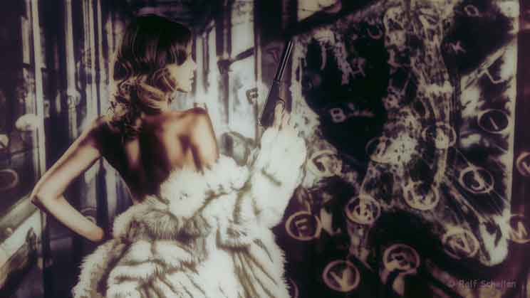 Info: Selbst während des Kalten Krieges konnten sich hinter dem eisigen Eisernen Vorhang heiße Liebesaffären abspielen. Berühmte Spionagethriller inszenieren die gefährliche Liebesgeschichte zwischen Geheimagenten aus Ost und West. Die attraktive Gegenspielerin vom anderen Dienst wechselt die Seiten und wird zur Gespielin eines Leinwandhelden - sie geht mit ihm durch dick und dünn und durch viele Actionszenen. Kurzum: Heimliche Liebe. Eine der Geheimwaffen ist sicherlich die Erotik. Genau dieses Element symbolisiert der Fotokünstler Ralf Schellen in seiner Bildkomposition mit der knisternden Liaison von nackter Haut und edlem Nerz. Züge sind beliebte Schauplätze in Kriminal- und Spionagefilmen, weil sie einen rasanten, jammernden und isolierten Raum für die Handlung bieten. Auch in diesem Spy-Art-Motiv scheinen Undercover-Agenten unterwegs zu sein (... vielleicht im Orient-Express, vielleicht auf der Jagd nach Dechiffriermaschinen?). Der Schalldämpfer der Spy Beauty verweist auf ein tödlich leises Intrigenspiel; das in einem stilisierten Herzmuster zerbrochene Wagenfenster verweist auf das Hauptthema: Heimliche Liebe. Die reduzierte Farbgebung und die Weichzeichner-Optik der Komposition zitieren den Kinostil, wie er in den frühen 1960er Jahren gefeiert wurde. Retro-Look in Aktion.