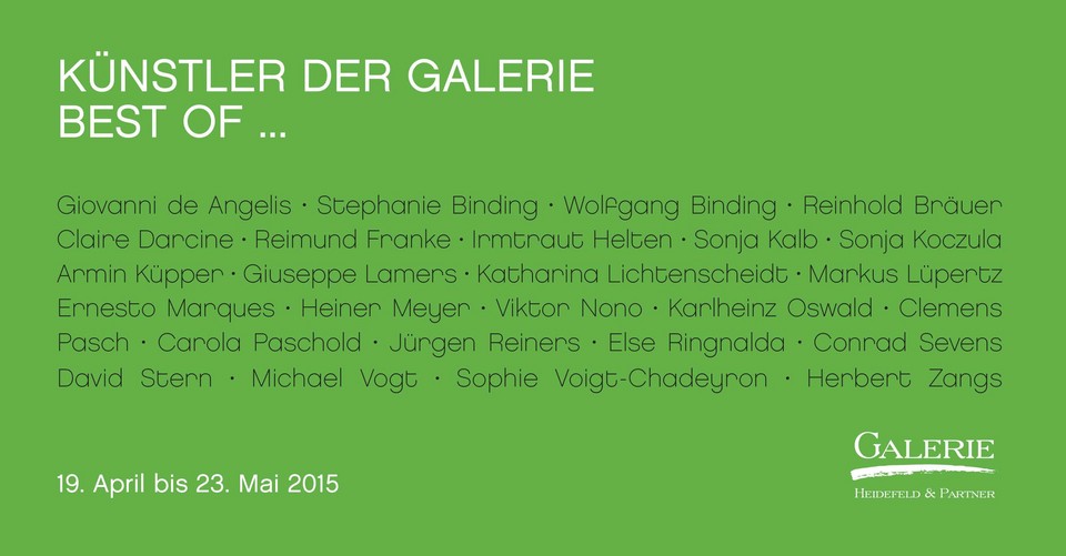 Zur Abschlussvernissage unserer Ausstellungsreihe „20 Jahre Galerie Heidefeld“ am Sonntag, dem 19. April 2015, 15.00 - 18.00 Uhr in der Galerie Heidefeld & Partner, laden wir Sie und Ihre Freunde herzlich ein.
