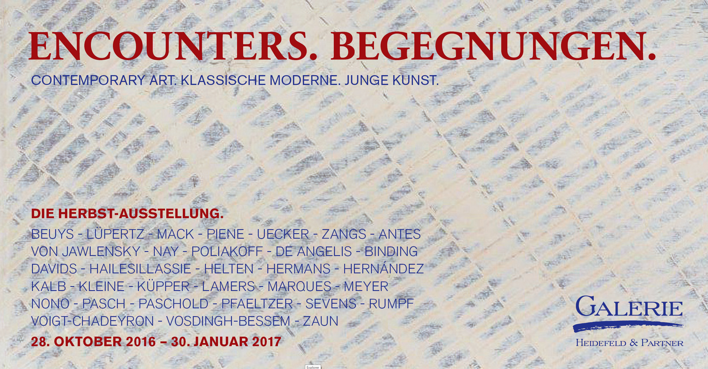 Kunst ist Interaktion, ist Begegnung - mit dem Werk und, für den Betrachter, auch mit sich selbst. Mit Gedanken, Gefühlen, Empfindungen, Erfahrungen. Vor diesem Hintergrund hat die Galerie Heidefeld & Partner ihre Herbst- und Winter-Ausstellung 2016/17 unter dem Leitmotiv kuratiert: Encounters. Begegnungen.
