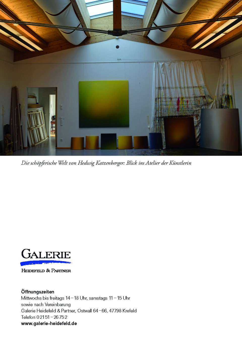 Die meist monochrome Malerei von Hedwig Katzenberger erscheint in virtuoser Abstraktion, ohne gegenständliche Anspielungen und figurative Zitate – und entfaltet aus der Stille ihrer Präsenz eine faszinierende Ausstrahlung und Magie. Es sind Bilder, die den visuellen Eindruck zu Stimmungen weiten, mal luzid-hell, mal tiefergründig-dunkel.