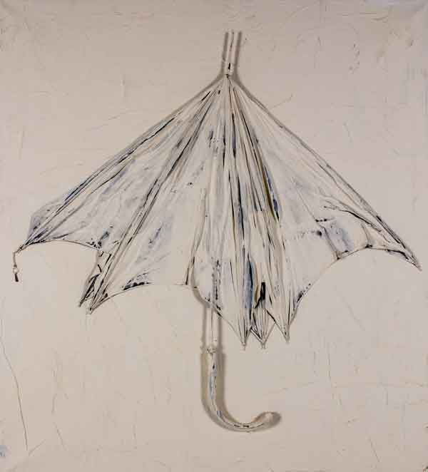Materialcollage Regenschirm auf Leinwand, verweißt - 110 x 100 cm