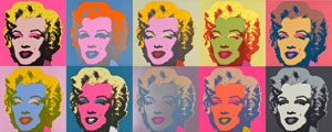 In dieser Manier ist auch seine Serie “Marilyn Monroe” gehalten. Mit auffälligen Farbvariationen und von Hand eingezeichneten Linien differenziert er die einzelnen Darstellungen und schafft mit Hilfe der verschiedenen Farbkombinationen zehn Variationen eines einzigen ikonografischen Themas.