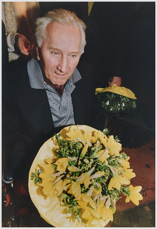 Florales gehört nicht zu den typischen Sujets seines Schaffens, aber über das Bouquet hat er sich gefreut: Herbert Zangs am 24. März 1999, seinem 75. Geburtstag, in der Galerie Heidefeld & Partner - anlässlich der Ausstellung "75 Jahre Herbert Zangs".