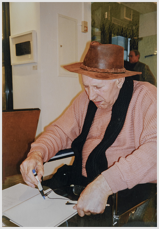 Der Künstler signiert Herbert Zangs trägt sich ins Galerie-Gästebuch ein. Wie immer mit markanten Schriftzügen.