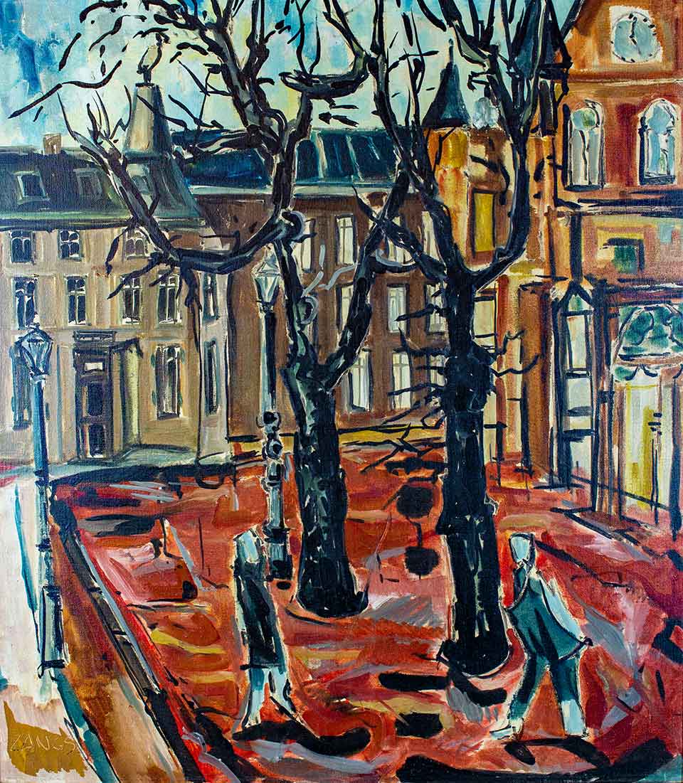 Doch Herbert Zangs ist weit mehr, viel mehr als der absolute Avantgardist der 50er Jahre. Sein ?uvre bewegt sich in vielfältigen Dimensionen. Die Galerie Heidefeld & Partner handelt auch mit Zangs-Werken aus den 1960er Jahren, späteren Arbeiten und - als ganz besonderer Rarität - mit der kleinen Reihe seiner "England-Bilder". Diese Seltenheiten sind 1958 entstanden, als der Künstler für einige Zeit in London lebte. In der britischen Metropole wurden die "England-Bilder" auch zum allerersten Mal ausgestellt - 1958 in der Drian Gallery. Die Werke haben, trotz ihres Serien-Titels, nichts mit der Verbindung zu Krefelds britischer Partnerstadt Leicester zu tun.